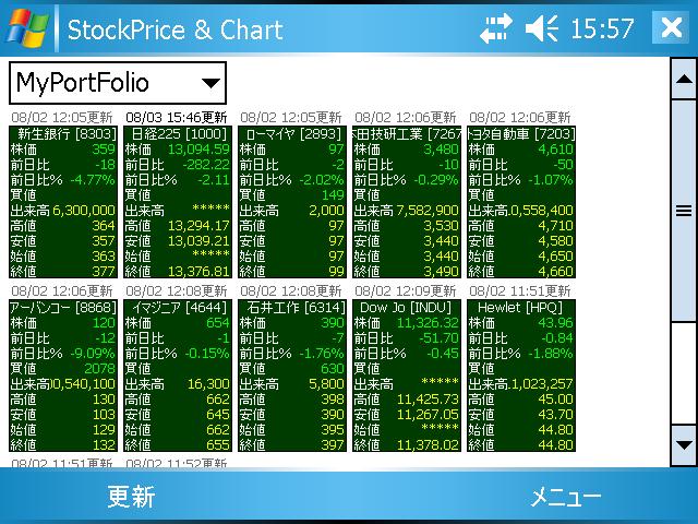機能追加とバグ・フィックスがあります。 - (バグ・フィックス)PC2003でチャートをメニューから起動するとハングするのを修正。 - (バグ・フィックス)StockPriceの株価ボードの銘柄名を、6文字ではなくボード内で表示できる文字数で表示するよう修正。 - (バグ・フィックス)StockPriceの株価ボードを表示領域一杯まで表示出来るよう修正。 - (バグ・フィックス)Helpコンテンツを修正。 - ( 機能追加)StockChartでデータ検索時にプログレスバーもどきを追加。 PC2003/PC2003SEは年内くらいでサポートをやめて、WM5,WM6に移行して行く予定です。 時系列データをリポジトリに置いて扱うのにWindows Mobileのみで提供される機能を使おうと考えています。 ダウンロードはここから。(2008/11/08 配信終了) PR |