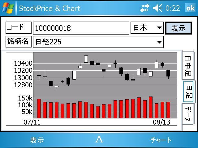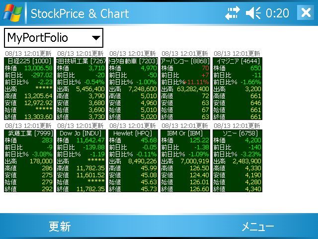 機能追加とバグ・フィックス・いくつかの変更があります。 - (機能追加)日足1ヶ月の全画面表示。 - (機能追加)時系列データのエクスポート。 - (機能追加)ダウンロード中のプログレス表示(まだ改善中です) - (フィックス)幾つかのメモリ・リークを修正。 - (フィックス)SIPのUp/Downのハンドリングを修正。 - (フィックス)株式コードを手入力した場合、画面の回転で情報が失われるのを修正。 - (フィックス)株価ボードをタップしてチャートを呼び出した際、正しいチャートが表示されないことがあったのを修正。 - (変更)アーバンのように出来高が100Mを超える場合、最上位桁が表示されなかったのを”出来高”の表示”出高”として全桁表示できるように変更。 - (変更)エラーコードの表示を10進から16進に変更。 - (変更)CABファイルでの配布できるようにCABファイルの名前/構成変更。 ダウンロードはここから。(2008/8/23配布終了) |