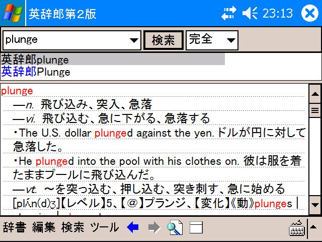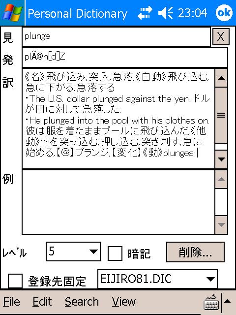 PDAでも英辞郎データが使える辞書ソフトには - PDIC(PDIC形式) - EBpocket (EPWING形式) といったものが検索で引っかかってきました。 まず、英辞郎第2版のCDROMからWinXP用の”PDIC for Win32”をInstall。 しばらく進めるとPDA用にUnicode版を使いたい場合、データをUnicodeでのdic形式で用意する必要があるとのこと。 1)Personal Dictionary / Unicode版 Ver.070 (β→α)をInstall。 2)辞書データをPersonal Dictionary / Unicode版を使って変換。 3)4700にもUnicode版のPDICUCE PocketPC ARM V1.5をInstall。 早速、一昨日Yahoo.com/Financeで日本株式市場2年ぶりの株価暴落を伝えるReportに出てきた単語 "plunge" と入力。う~ん、はっ早い。。。 出てきたラインを2回タップ。あれれ。見辛い。 横にしてみたら。。。画面のサイズがQVGA決め打ちのようです。 ”ポップアップ検索ウィンドウ”文章を手で入力して、その中の単語をカーソルで選択して。。。すごい!良く出来てる。 ということで。今日はこれくらいに。。。 私向きの辞書検索ソフトではないようなので次回はEBpocketで。(ヲイッ!) 実際は素人のため、ここまで来るのに沢山時間がかかったのですが中略でお届けしてしまいました。あたりまえなのですが専用機のSR-T5030を使うようには行きません。 こんな贅沢が言えるのは、先人の皆様の苦労と費やした膨大な時間のおかげでとても幸福な事だと思います。御免なさい。 |